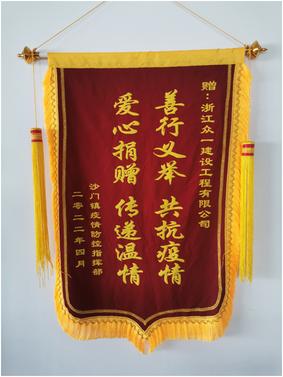 近期,我們收到了來自沙門鎮(zhèn)疫情防控指揮部的一面寫有“善行義舉 共抗疫情 愛心捐贈 傳遞溫情”的錦旗,我們也將繼續(xù)以實際行動踐行企業(yè)的社會責(zé)任和擔(dān)當(dāng)。