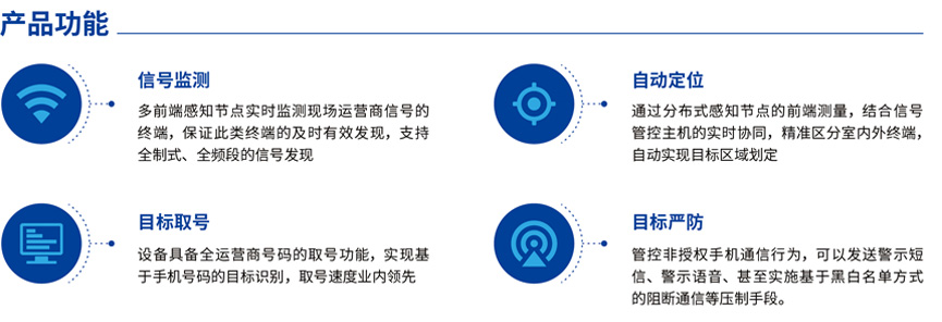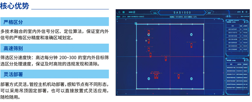 敏感場所手機精準(zhǔn)管控系統(tǒng)是針對敏感場所傳統(tǒng)手機管控設(shè)備存在漏管誤管、無法區(qū)分內(nèi)外、無法自動定位、部署不靈活等問題,從客戶需求和實戰(zhàn)應(yīng)用出發(fā),自主研制出的機動靈活、高速篩選區(qū)分、智能劃片/定位的手機管控領(lǐng)域“黑科技”產(chǎn)品。系統(tǒng)采用高速篩別處理技術(shù)、多節(jié)點協(xié)同定位技術(shù)以及智能管控流程,及時區(qū)分和發(fā)現(xiàn)敏感場所內(nèi)非授權(quán)手機,管控其通訊行為,自動執(zhí)行目標(biāo)位置區(qū)域劃定并在后臺圖形化呈現(xiàn),快速及時掌控、清除非授權(quán)手機,保障相關(guān)場所的信息安全。